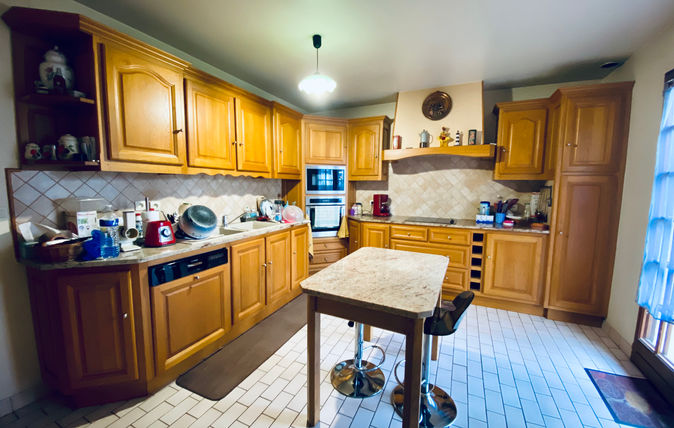 La maison dispose d'une cuisine aménagée de 16 m², prête à accueillir vos équipements, et d'un bel espace de vie de 39 m² comprenant un salon et une salle à manger avec cheminée, créant une ambiance chaleureuse et conviviale.